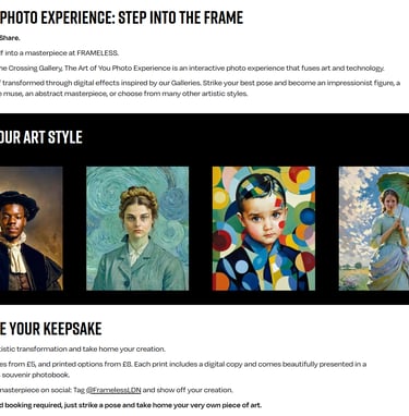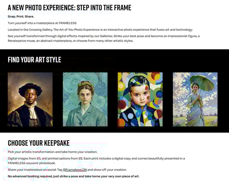 FRAMELESS is redefining the experiential immersive art world. Situated in Marble Arch, we are the largest permanent multi-sensory experience in the UK. FRAMELESS features four galleries and showcases some of the world’s greatest works of art presented in ways never seen before. Where art breaks free.